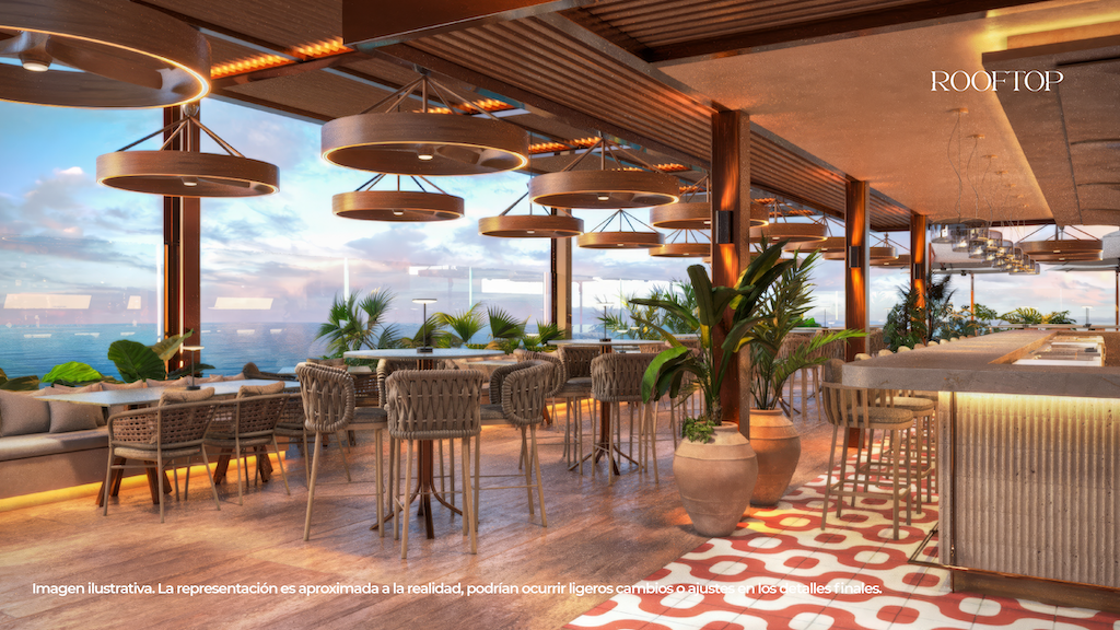 -Lobby con recepción profesional que eleva la experiencia de los propietarios desde su llegada -Alberca con club de playa tipo resort como principal atractivo visual y de estancia -Restaurantes gourmet en planta baja y roof top, que permitirán a los propietarios gozar de una comida o una deliciosa cena con vista al mar -Spa con servicio premium -Gimnasio -Sky Bar *Los precios pueden cambiar sin previo aviso.